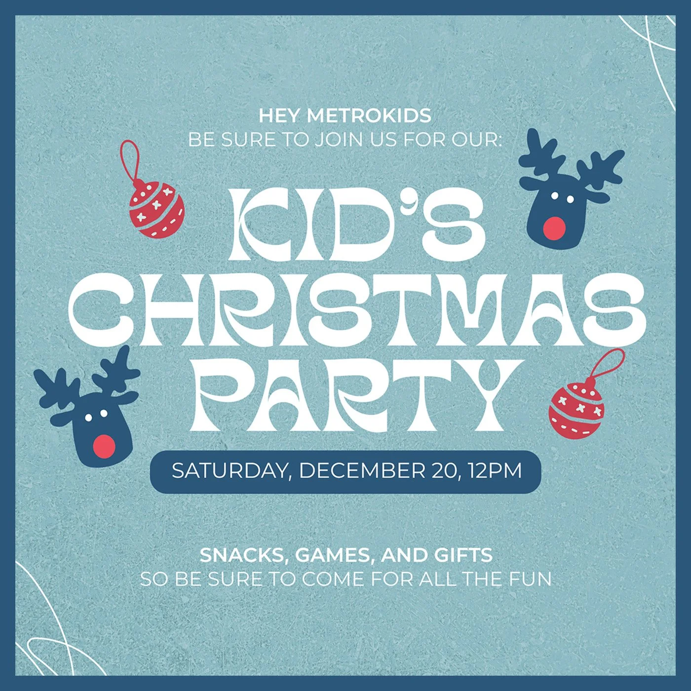 Get ready for an afternoon of FUN at our Kid’s Christmas Party on Saturday, December 20 at 12PM right here at Metro! We’ll have exciting games, yummy snacks, and special gifts for every child. You won’t want to miss it—so mark your calendars and come ready to celebrate!